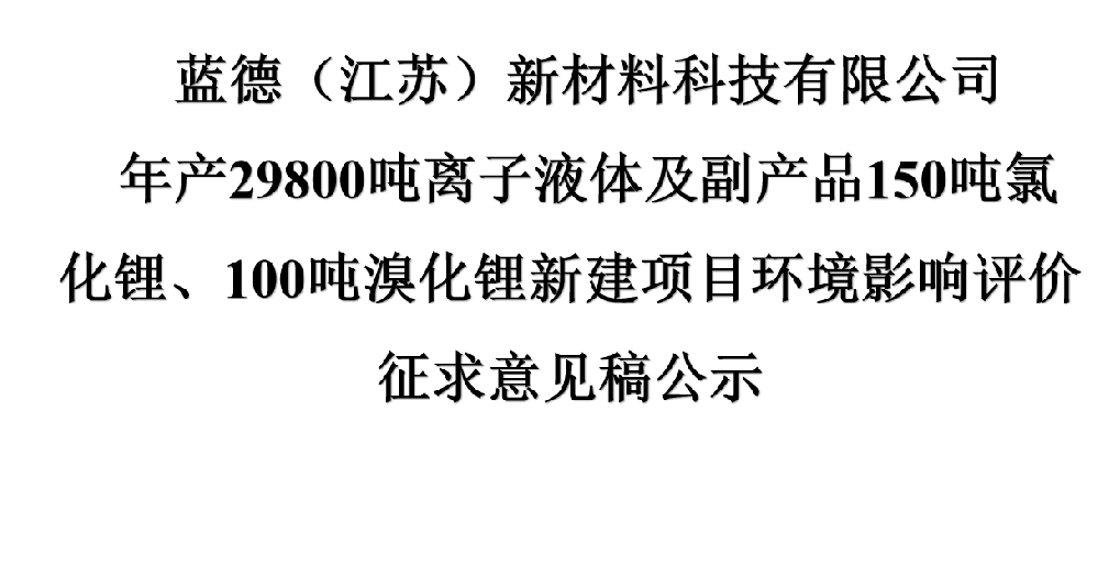 藍德(江蘇)新材料科技有限公司 年產(chǎn)29800噸離子液體及副產(chǎn)品150噸氯化鋰、100噸溴化鋰新建項目環(huán)境影響評價征求意見稿公示